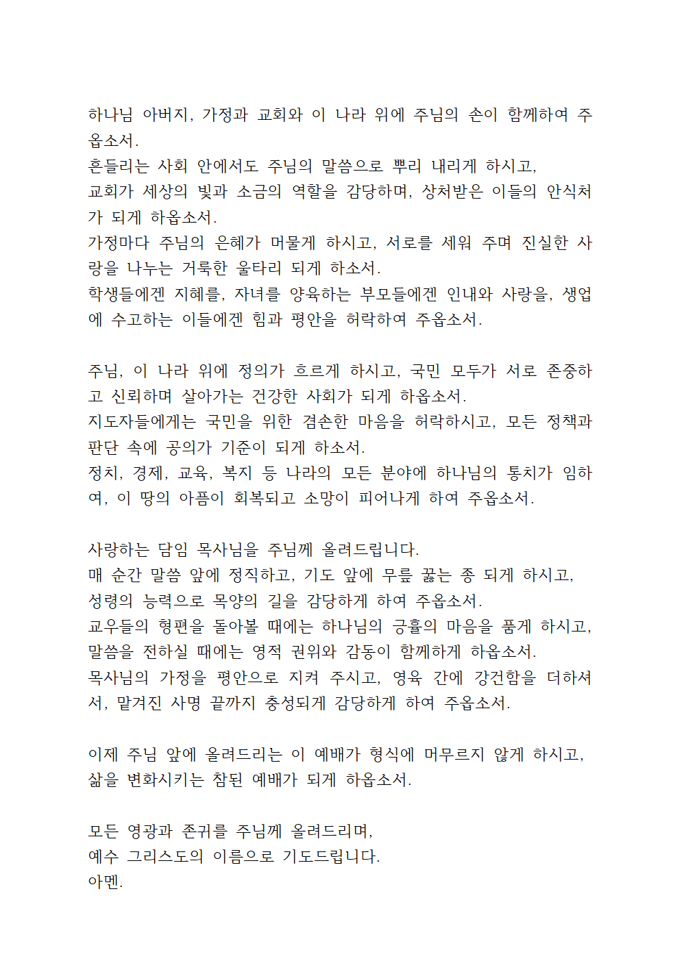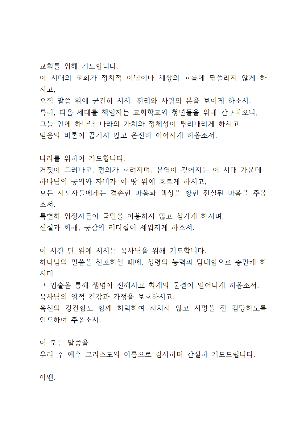 혼란과 갈등의 시대 가운데 교회가 하나님의 뜻을 밝히며, 사회의 중심에서 기도와 사랑의 사명을 다하게 하옵소서. 경제적으로 어려운 이들, 가정의 위기를 겪는 이들, 소외되고 아픈 이들에게 주님께서 위로와 길을 열어주시기를 간절히 기도드립니다.