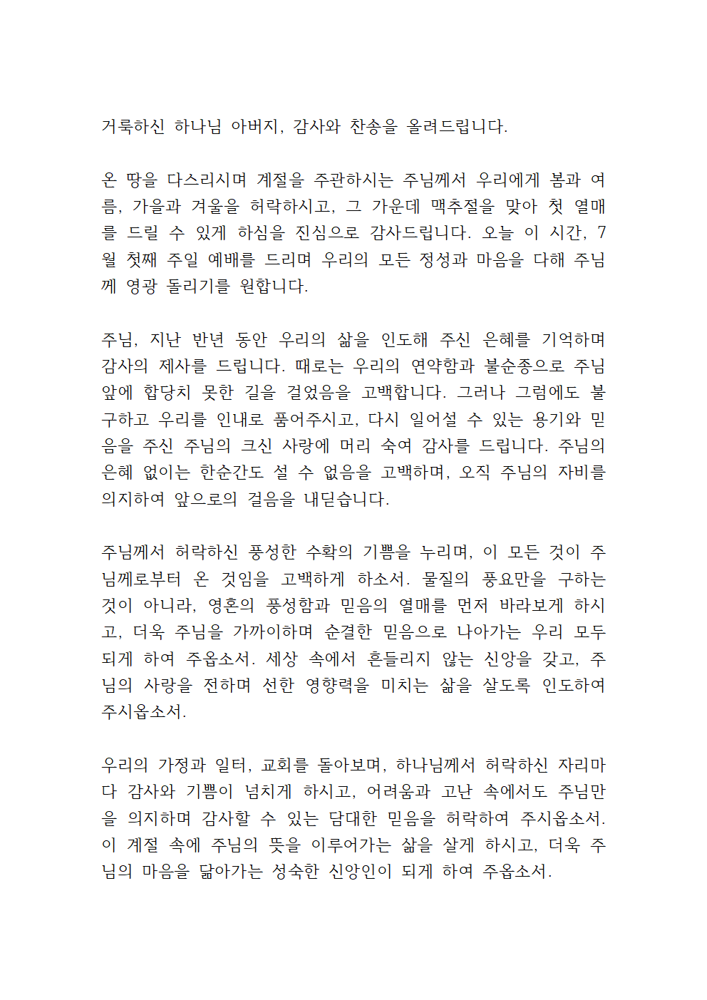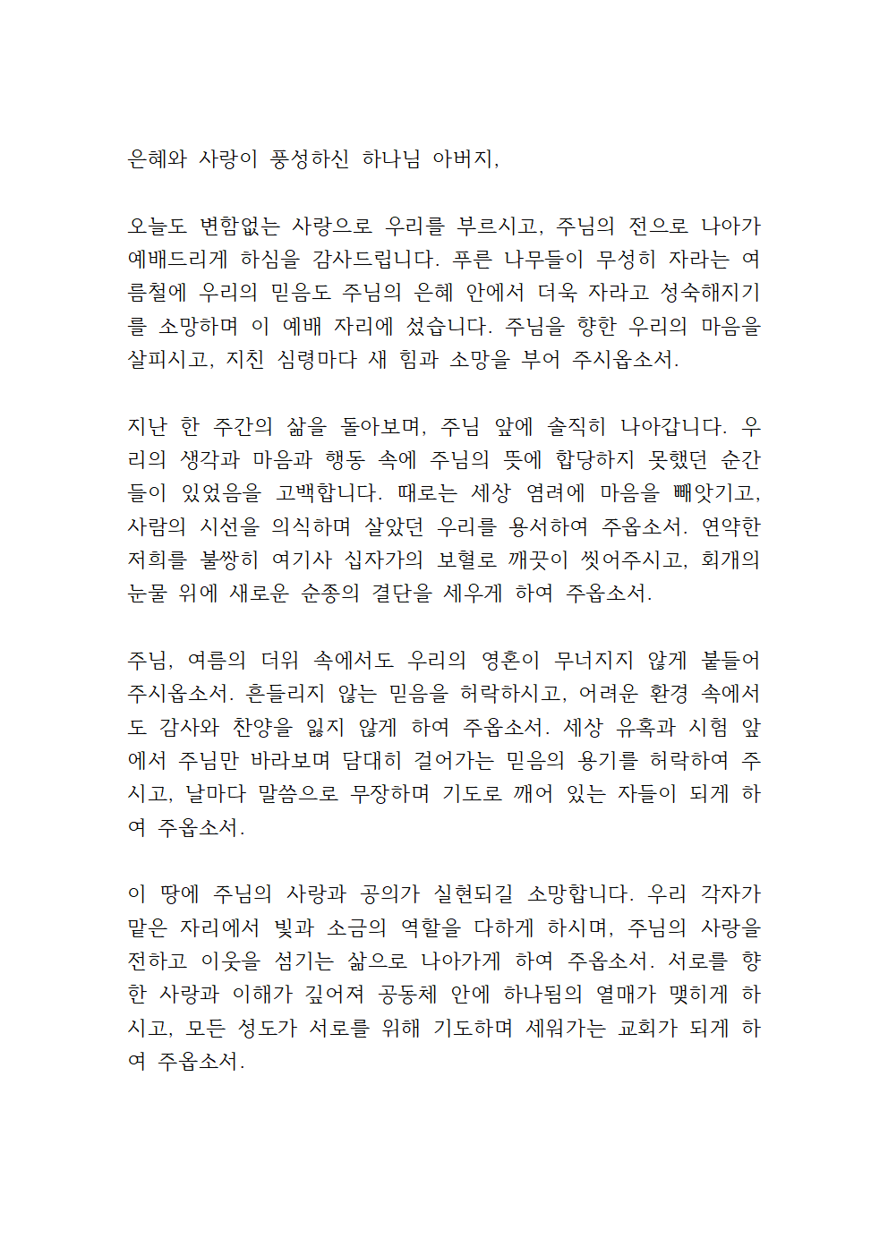 7월 첫째 주일낮예배 대표기도문 (hwp 첨부)