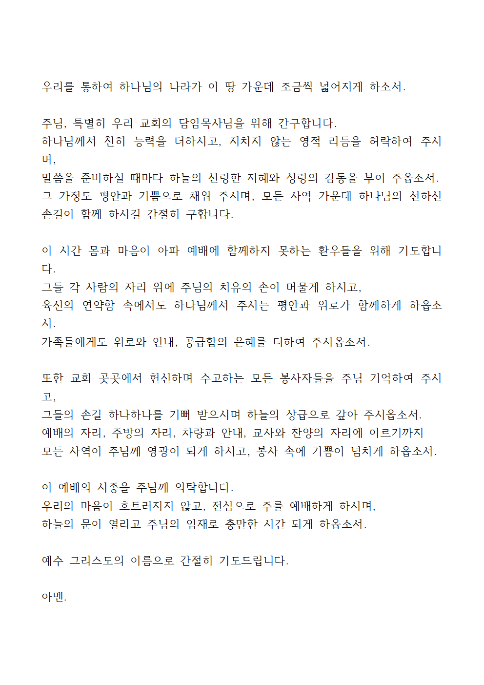 말씀을 전하실 목사님께 성령의 충만함을 더하시고, 준비된 말씀이 주님의 음성으로 선포되게 하옵소서. 그 말씀이 우리의 심령을 찌르고 변화시켜 삶의 자리에서 실천되게 하시며, 말씀을 통해 위로와 도전, 믿음의 결단이 일어나게 하옵소서. 오늘 드리는 찬양과 기도와 봉헌이 모두 하나님께 향하는 향기로운 제물이 되게 하시고, 이 예배를 통해 주님 홀로 영광 받아 주옵소서.
