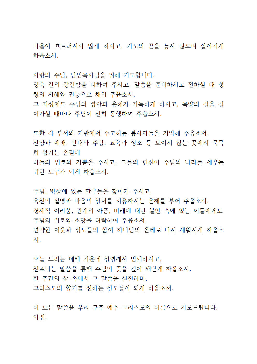 이제 말씀을 전하실 목사님께 성령의 기름 부으심을 덧입히셔서 그 말씀이 우리의 심령을 새롭게 하고, 삶의 변화를 이루는 능력이 되게 하옵소서. 예배를 통해 받은 은혜가 주일 하루에 머무르지 않고 한 주간의 삶 속에서 사랑과 선행으로 나타나게 하시며, 가정과 일터, 학업과 사역의 자리마다 주님의 영광이 드러나게 하옵소서. 모든 영광을 주님께 올려드리며, 예수 그리스도의 이름으로 기도드립니다.